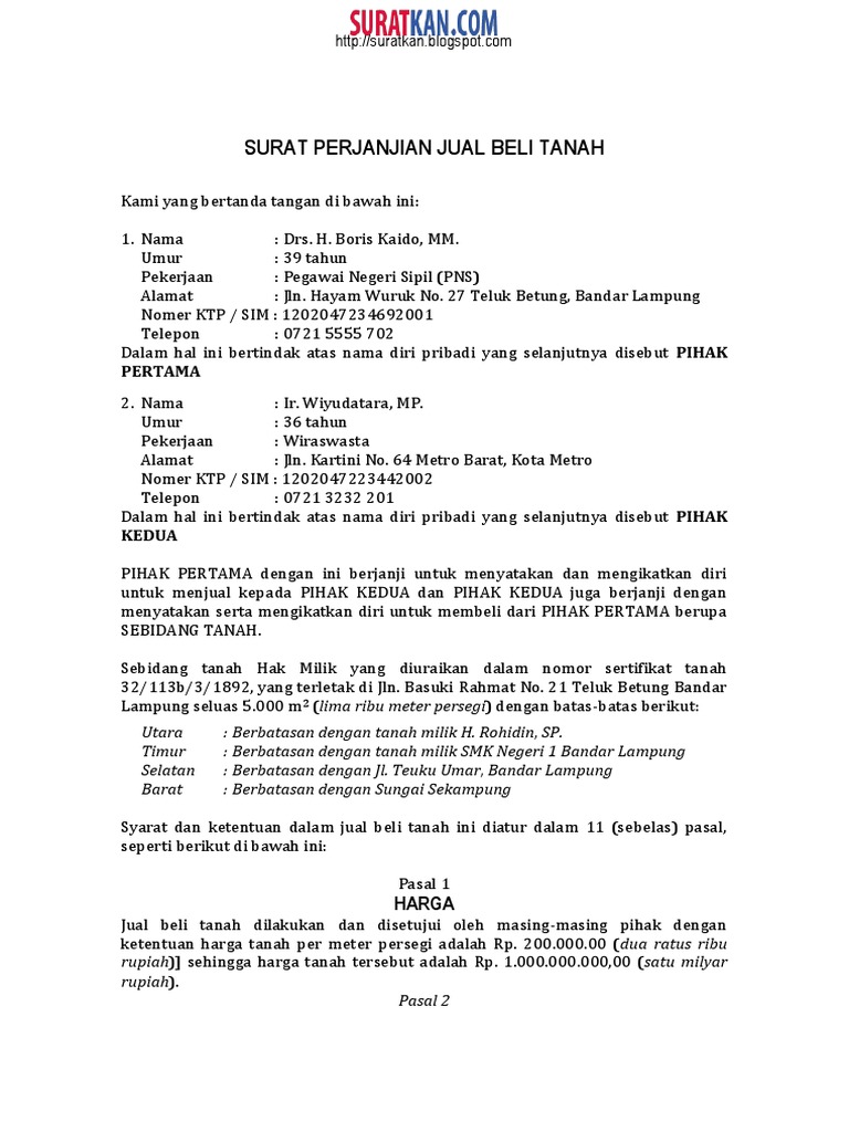Surat perjanjian sendiri mencakup banyak hal salah satunya untuk jual beli tanah. Contoh surat perjanjian jual beli. Demikian pernyataan jual beli ini kami buat dengan sesungguhnya surat perjanjian jual beli rumah. Terkait isinya, berikut beberapa poin penting surat perjanjian jual beli rumah yang haru kamu tujuannya, agar spesifikasi rumah lebih detail dan risiko kesalahan objek transaksi lebih kecil. Contoh perjanjian jual beli barang elektronik.
